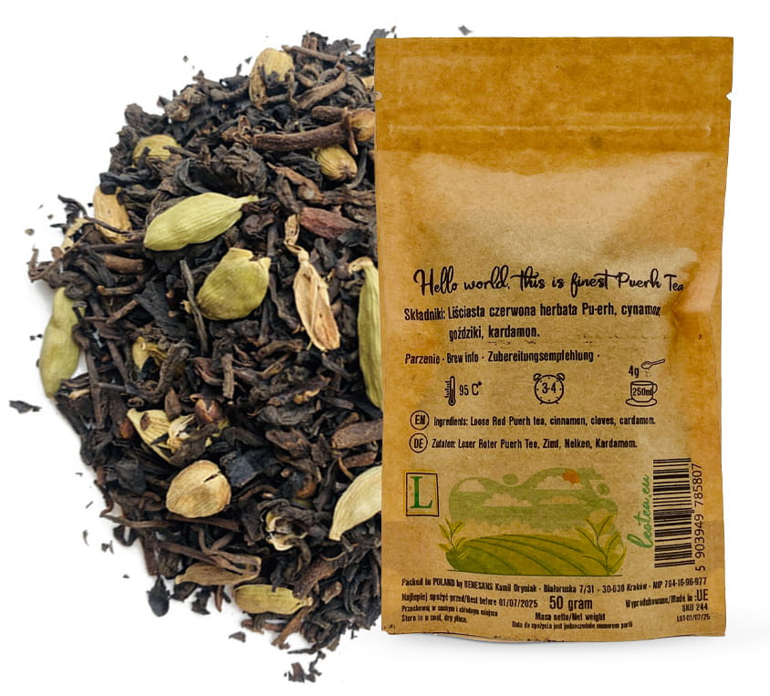 Pu-Erh Spice to intensywna i aromatyczna mieszanka czerwonej herbaty Pu-Erh z wyrazistymi przyprawami.