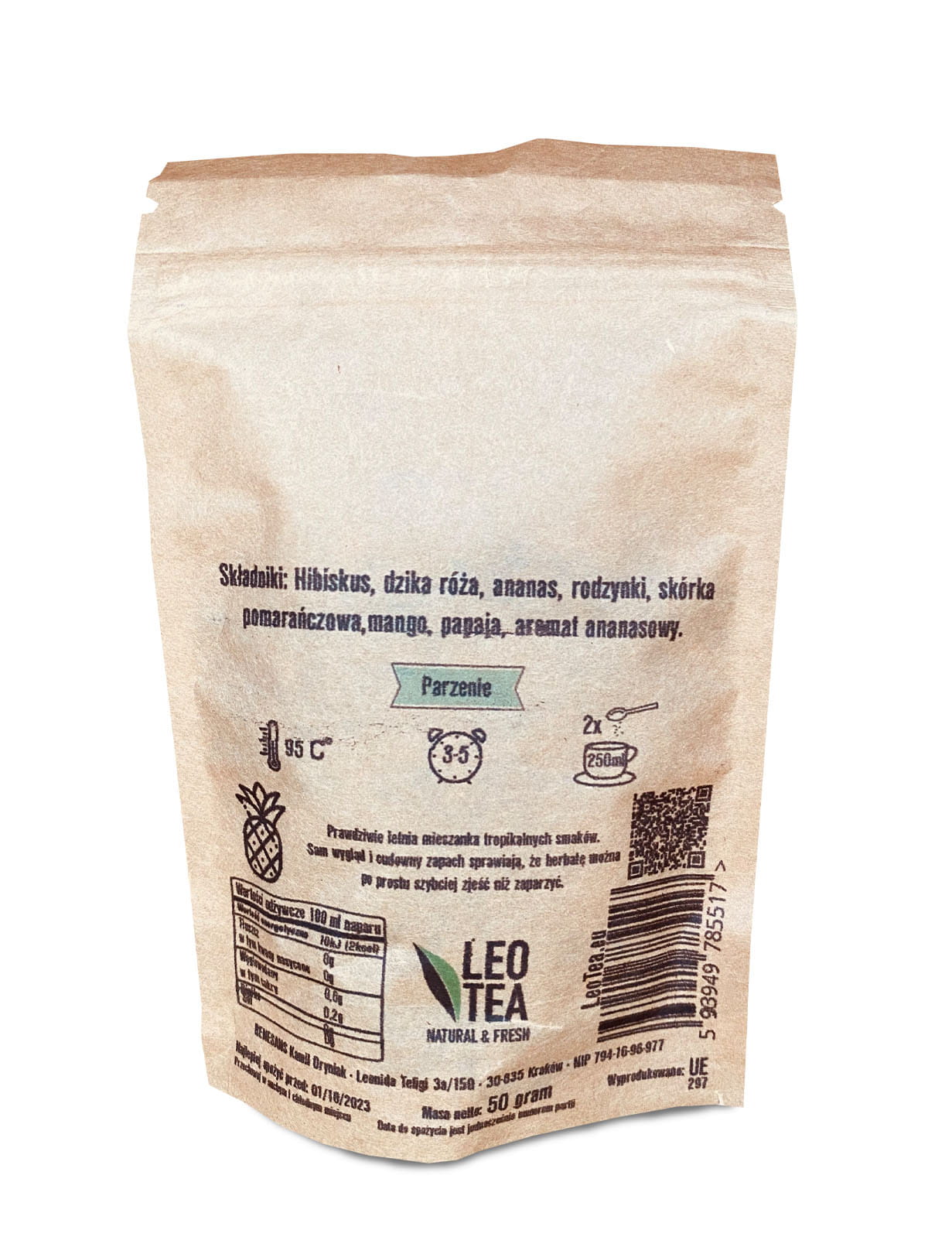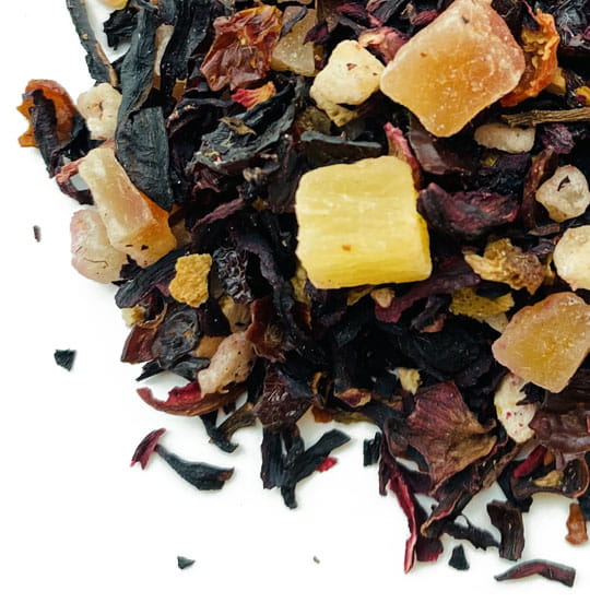 Mieszanka zawiera soczysty hibiskus, słodką czerwoną porzeczkę, tropikalnego ananasa, delikatne rodzynki, orzeźwiającą skórkę pomarańczy, egzotyczne mango i soczystą papają.