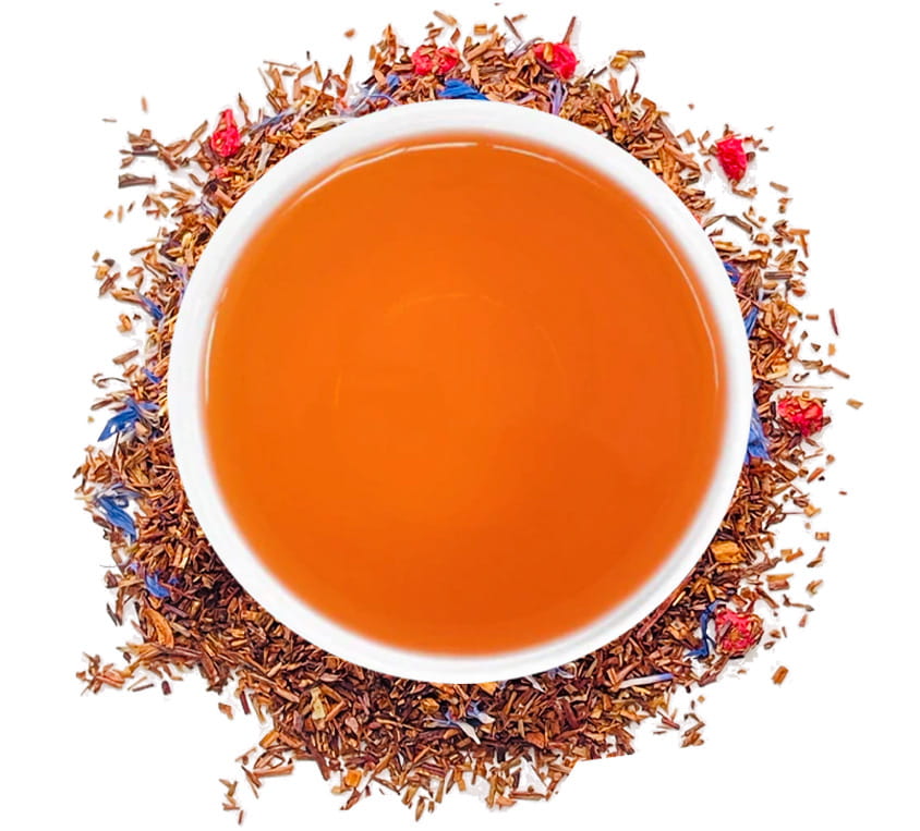 Rooibos Fruit marki Leo Tea to starannie przygotowana, owocowa mieszanka na bazie wysokiej jakości rooibosa z dodatkiem naturalnego aromatu malin, hibiskusa, liofilizowanych owoców i płatków bławatka.